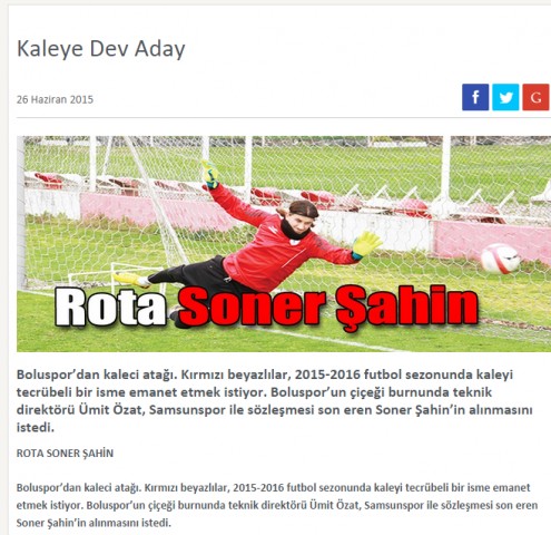 Boluspor transfer çalışmalarını sürdürüyor. Kırmızı beyazlı ekibin transfer komitesi Samsunspor'un kalecisi Soner şahin ile anlaştı. Yapılan görüşmelerin ardından Soner'in Bolusporla anlaşırken Şahin’in akşam idmanına çıkması bekleniyor.